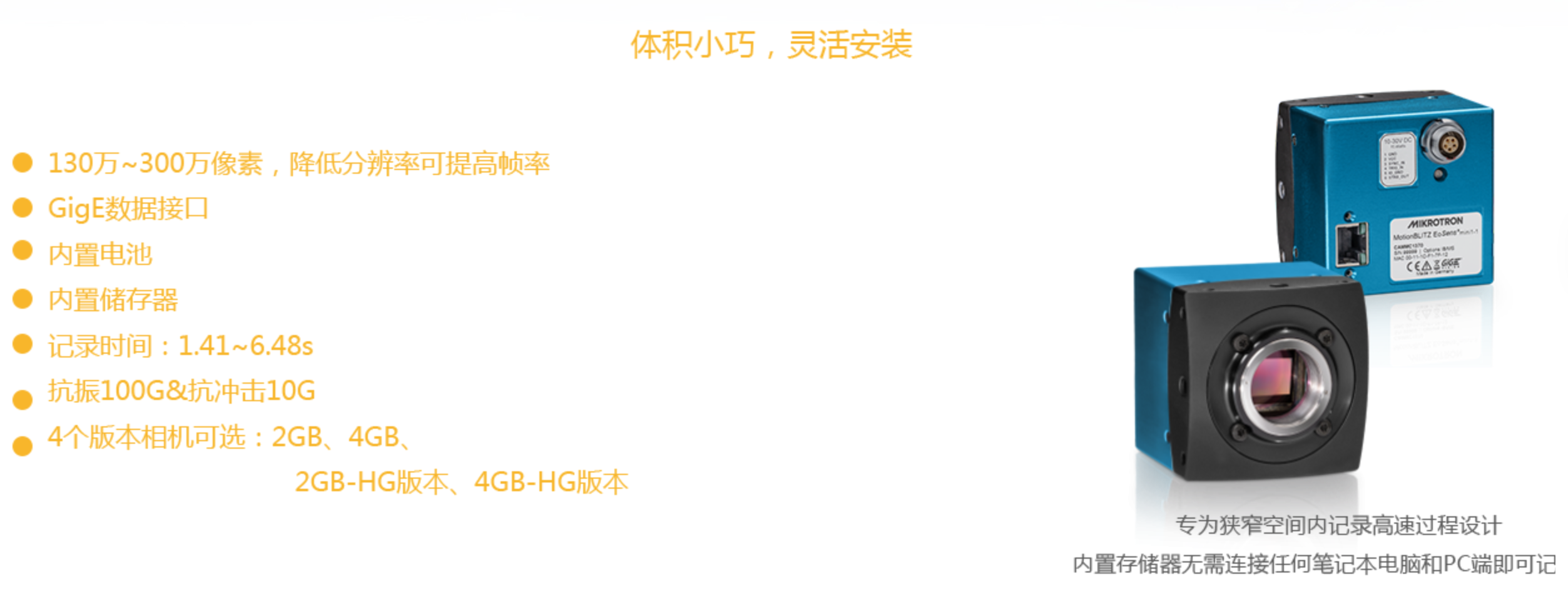 Mikrotron公司的一体式高速相机有两个系列:Cube/Mini系列以及TS系列。Cube/Mini系列用网线连接电脑,带有一定的板上内存用于高速存储,稍后用网线将数据导出至电脑。TS系列为独立带触屏显示屏显示屏,内置电池,板上存储,可插SSD卡以降低速度的代价延长存储时间。